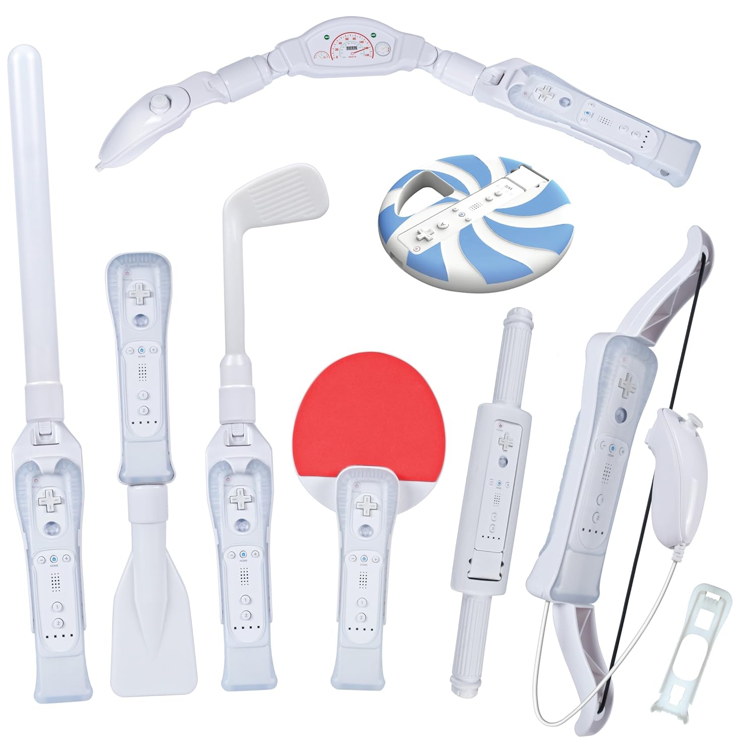 - Pack includes: Swordplay Attachment - Canoeing Attachment - Golf Club Attachment - Table Tennis Attachment - Frisbee Attachment - Wakeboarding Attachment - Archery Bow Attachment - Power Cruising Dashboard Handle